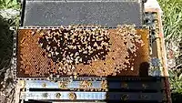 ![]() A frame covered with comb and bees | |