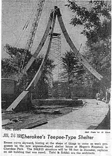Because of the shape of the shelter, it garnered a great deal of both media and public attention. "It will be a departure from the usual rectangular-shaped shelters built in parks in the past."[10] So it was that Al Blunk, photographer for the Louisville Times captured an early construction shot of the raising of the oversized laminated wood beams. The Times reported "Beams curve skyward, hinting at the shape of things to come …"[19]