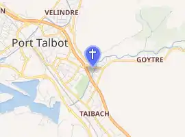 Holy Cross Church, Port Talbot, also known locally as the "Chapel of Ease", is a Victorian church located centrally in the Taibach district of Port Talbot, Wales.[2] Prior to the building of the M4 motorway flyover through the centre of the town in the 1960s, it was in the centre of a residential area, but it is now dominated by junction 40 of the motorway.[3] The land was originally donated by C. R. M. Talbot, MP, the owner of the Margam Abbey estate, as a church for local people who could not get to the abbey itself to worship.