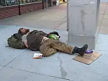 The Community Mental Health Act of 1963 was a pre-disposing factor in setting the stage for homelessness in the United States.[20] Long term psychiatric patients were released from state hospitals into Single Room Occupancies and sent to community health centers for treatment and follow-up. Never adequately funded, the community mental health system struggled to meet patient needs[21] and many of the "deinstitutionalized" wound up living on the streets, with no sustainable support system.[22][23] In the United States, during the late 1970s, the deinstitutionalization of patients from state psychiatric hospitals was a precipitating factor which seeded the population of people that are homeless, especially in urban areas such as New York City.[24]