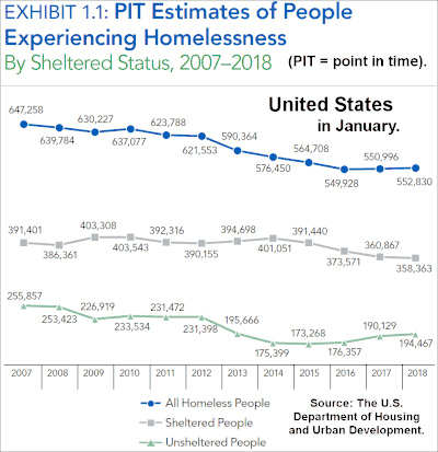 Homelessness in the United States refers to the issue of homelessness, a condition wherein people lack "a fixed, regular, and adequate nighttime residence" as defined by The McKinney–Vento Homeless Assistance Act. Point-in-time single night counts prepared by shelter providers differ greatly from federal government accounts. In 2014, approximately 1.5 million sheltered homeless people were counted.[1] The federal government statistics are prepared by the United States Department of Housing and Urban Development's Annual Homeless Assessment Report; as of 2018, HUD reported there were roughly 553,000 homeless people in the United States on a given night,[2] or 0.17% of the population. Annual federal HUD reports contradict private state and local reports where homelessness is shown to have increased each year since 201 across several major American cities, with 40 percent increases noted in 2017[3] and in 2019.[4] In January of 2018 the federal government statistics gave comprehensive encompassing nationwide statistics, with a total number of 552,830 individuals, of which 358,363 (65%) were sheltered in provided housing, while some 194,467 (35%) were unsheltered.[5]