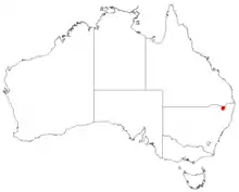 This species is restricted to Torrington State Conservation Area in northern New South Wales where it grows on shallow sandy soils in heath and shrubby woodland on or adjacent to granite outcrops.[6]