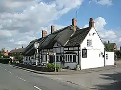 Honeybourne was two villages: Church Honeybourne was in Worcestershire while Cow Honeybourne was in Gloucestershire. Their names are derived from Old English hunig, "honey", and burna, "stream", the whole meaning "(places on) the stream by which honey is found"; the first word of Cow Honeybourne comes from Old English calu, "bare, lacking vegetation".[2] Boundary changes in 1931 moved Cow Honeybourne into Worcestershire and the two parishes were united in 1958.[3] Honeybourne has several historic timber framed and thatched buildings. The Thatched Tavern in Cow Honeybourne has a cruck truss.[4]