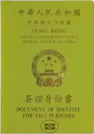 The Hong Kong Special Administrative Region Document of Identity for Visa Purposes (Chinese: 香港特別行政區簽證身份書) is a biometric travel document issued by the Hong Kong Immigration Department to residents of Hong Kong who are unable to obtain a national passport. It is usually valid for seven years.