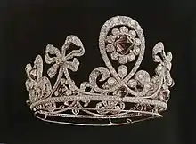 After the revolution, British diplomats helped recover some of the Russian Court jewelry, and the Vladimir Tiara, a diamond diadem with large pearl pendants that originally belonged to Grand Duchess Maria Pavlovna was bought by Queen Mary, wife to King George V, in 1921.[2][6][7]