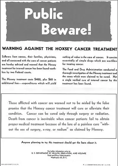 Hoxsey Therapy or Hoxsey Method is an alternative medical treatment promoted as a cure for cancer. The treatment consists of a caustic herbal paste for external cancers or an herbal mixture for "internal" cancers, combined with laxatives, douches, vitamin supplements, and dietary changes. Reviews by major medical bodies, including the U.S. Food and Drug Administration (FDA), the National Cancer Institute, the American Cancer Society,[1] M. D. Anderson Cancer Center,[2] and Memorial Sloan-Kettering Cancer Center,[3] have found no evidence that Hoxsey Therapy is an effective treatment for cancer. The sale or marketing of the Hoxsey Method was banned in the United States by the FDA on September 21, 1960 as a "worthless and discredited" remedy and a form of quackery.[4]