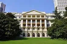 The hospital was established in 1921 as the Country Hospital,[2] known in Chinese as Hong'en Hospital (宏恩医院).[3] Its main H-shaped building on Great Western Road (now Yan'an Road), opened in 1926, was donated by an anonymous British businessman to the Shanghai Municipal Council, the governing body of the Shanghai International Settlement. Designed by the Hungarian-Slovak architect László Hudec and constructed by the firm Pan Rong Ji (潘荣记),[3][4] it is now protected as a Municipal Heritage Building of Shanghai.[3]