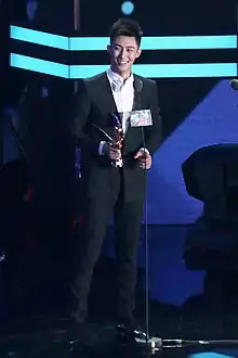 In 2018, Huang starred in the patriotic action film Operation Red Sea directed by Dante Lam which premiered in February.[9] The film has grossed US$579 million, making it the highest-grossing Chinese film in 2018.[10] Huang won the Best Newcomer Award at the Asian Film Awards for his performance in Operation Sea.[11] The same year, Huang starred in the fantasy romance drama Moonshine and Valentine alongside Victoria Song.[12] The series received positive reviews for its high quality production, tight plot and fresh characterizations;[13] and Huang was also praised for his performance and use of original voice.[14] He also featured in a spin-off of the romance drama My Story for You. Forbes China listed Huang under their 30 Under 30 Asia 2017 list which consisted of 30 influential people under 30 years old who have had a substantial effect in their fields.[15]
