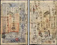 The precursor of paper money (紙幣) known as "Flying cash" were issued by the Tang dynasty, however these bills of exchange could in no way be considered to be a form of paper money as they weren't meant to be a medium of exchange and were only negotiable between two distant points.[13] The first true paper money in the world was issued under the Song dynasty, these were promissory notes issued by merchants in Sichuan known as the Jiaozi,[14] under the reign of Emperor Zhenzong (997–1022) the government of the Song Dynasty granted a monopoly for the production of Jiaozi notes to sixteen wealthy merchants in Sichuan, as these merchants were slow to redeem their banknotes and inflation started affecting these private banknotes the government nationalised paper money in the year 1023 under the Bureau of Exchange. As these paper notes were backed by the government they were instantly successful and the people regarded them to be equally trustworthy as cash coins, other types of paper notes issued under the Song dynasty include the Huizi and the Guanzi.[15] Before the Mongol Empire conquered China the Jin dynasty also issued paper money.[16][17]