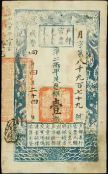 During the transition from Ming to Qing the Manchu government issued banknotes known as Hubu Guanpiao (戶部官票) or Shunzhi Guanpiao (順治官票) or Shunzhi Chaoguan (順治鈔貫)[3] which were first issued in the year 1651 on initiative of the Minister of Revenue, Wei Xiangshu (魏象樞) during the war with the remnants of the Ming dynasty to cover the more immediate expenses of the Manchus as the finances of the Qing during this period were in dire distress, these banknotes were declared void only a decade after their issued. An annual amount of 128,000 guàn (貫) were issued, with a total sum of 1.28 million guàn being produced before they were abolished. The denominations of the Hubu Guanpiao followed the pattern of the Ming dynasty period paper notes, but as historiographical sources about the early Qing era paper money are scarce, not much can be known about them.[4][5] After the Hubu Guanpiao it was only rarely suggested by court officials to reintroduce paper money to the Qing Empire, among these were Cai Zhiding (蔡之定) in 1814 and Wang Yide (王懿德) in his treatise on money known as Qianbi Chuyan (錢幣芻言).[6]