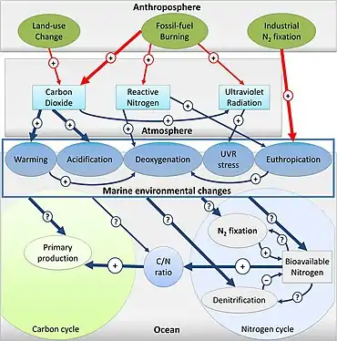 While the full implications of elevated CO2 on marine ecosystems are still being documented, there is a substantial body of research showing that a combination of ocean acidification and elevated ocean temperature, driven mainly by CO2 and other greenhouse gas emissions, have a compounded effect on marine life and the ocean environment. This effect far exceeds the individual harmful impact of either.[116][119][118] In addition, ocean warming exacerbates ocean deoxygenation, which is an additional stressor on marine organisms, by increasing ocean stratification, through density and solubility effects, thus limiting nutrients,[120][121] while at the same time increasing metabolic demand.