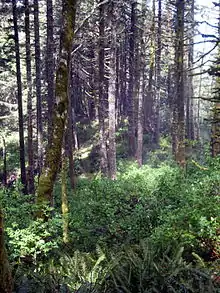 Many types of plants inhabit Humbug Mountain. The most common types of trees include tanoak, Douglas fir, big-leaf maple, Port Orford cedar, and Oregon myrtle.[4][5][9][16] Spruce, alder, and western red cedar can also be found.[17] Smaller plants such as maidenhair ferns, wild rhododendrons, and vanilla leaf are abundant in the area.[4][5][9][16] Wildflowers such as Columbia lilies, trilliums, and bleeding hearts grow in the spring.[4][7][9] Currant, elderberries, blackberries, thimbleberries, huckleberries, and salmonberries are some of the many berries that grow on the mountain.[7]