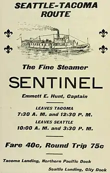 In 1898, the Hunt Brothers had Sentinel built at the Crawford and Reid shipyard in Tacoma, and placed her on the East Pass Route between Tacoma and Seattle. In 1899, they had Crest built at Tacoma for service on the Tacoma-Gig Harbor route[2]