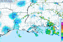At 00:00 UTC on July 11, the system developed into a tropical depression about 200 mi (320 km) south of Mobile, Alabama. The depression intensified into Tropical Storm Barry six hours later as the convection had increased to the south of the system's circulation.[2] The storm's convection organized into a large rainband south of an elongated circulation,[7] though mid-level dry air and northerly wind shear prevented thunderstorms from forming near the center.[8][2] On July 12, data from two hurricane hunter reconnaisance aircraft found that Barry had quickly intensified, with its central pressure dropping.[9] Due to a slight decrease in shear on the morning of July 13, the storm's outflow expanded and the banding increased.[10] Barry attained Category 1 hurricane status by 12:00 UTC that day, with a small area of hurricane-force winds occurring east of the center.[11] Simultaneously, the storm reached its peak intensity, with a minimum central pressure of 993 millibars (29.3 inHg).[2] At 15:00 UTC that day, Barry made landfall as a Category 1 hurricane on Marsh Island, Louisiana.[12] Barry was one of four hurricanes to hit Louisiana at Category 1 intensity in the month of July, the others being Bob in 1979, Danny in 1997, and Cindy in 2005.[1]