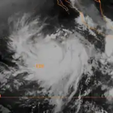 The seventh tropical cyclone of the season originated from a tropical depression that developed during the afternoon hours of July 23 about 200 mi (320 km) north of Clipperton Island. Due to light wind shear and warm ocean temperatures, the Eastern Pacific Hurricane Center (EPHC) upgraded the depression to Tropical Storm Gil at 0000 UTC on July 24.[1] Gil was briefly expected to re-curve and approach Baja California Sur, but this never materialized.[2] Gil subsequently began to intensify; on 0000 UTC July 25, the EPHC reported that Gil had intensified into a strong tropical storm, with winds of 70 mph (115 km/h). Roughly 24 hours later, the storm was upgraded into a Category 1 hurricane on the Saffir-Simpson hurricane wind scale. Early on July 27, the storm attained its peak intensity of 90 mph (145 km/h). Despite turning west-northwest, Hurricane Gil maintained hurricane intensity until 1200 UTC July 29 when the storm began to encounter cooler waters. By 0000 UTC July 31, Gil was downgraded a tropical depression.[1]