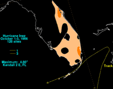 When the hurricane moved across the Florida Keys, it dropped light rainfall, reaching 4.80 in (122 mm) near Kendall.[28] Inez was considered a "dry hurricane", and about 1 in (25 mm) of the precipitation that fell was largely in the form of sea water spray.[29] Light rainfall occurred in Miami, where strong winds damaged crops due to salt spray onto local vegetation.[30] During its passage, Inez produced above normal tides, reaching 5 ft (1.5 m) above normal on Big Pine Key. Inez produced strong winds while it was intensifying,[3] and the strongest winds occurred after the passage of the eye.[23] The highest sustained winds were 98 mph (158 km/h) on Plantation Key, and peak gusts were 120 mph (190 km/h) in the Dry Tortugas. On Big Pine Key, sustained winds were estimated at 150 mph (240 km/h), with gusts to 165 mph (266 km/h). On the Florida mainland, the highest gusts were 92 mph (148 km/h) at Flamingo.[3] The winds damaged smaller tree limbs and uprooted some trees. About 20% of the local avocado crop was blown off trees, although most was salvageable. Winds and salt spray severely damaged vegetables in southern Dade County, including up to 80% losses of tomatoes in some farms.[29] Power outages were reported in Key West.[13] In the Florida Keys, the hurricane damaged 160 homes and 190 trailers.[26] Statewide, damage totaled $5 million,[3] and there were four deaths; three were elderly people who died of heart attacks while installing shutters, and the fourth was a teenager who was swept by large surf.[13] Inez was the last hurricane to threaten the Miami metropolitan area until Hurricane David in 1979,[31] and the last hurricane to strike the Florida Keys until Hurricane Kate in 1985.[32]