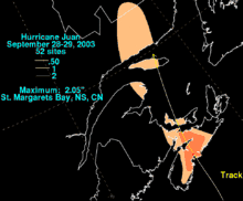 Hurricane Juan was a significant tropical cyclone that heavily damaged parts of Atlantic Canada in late September 2003. Juan is also the first hurricane name and one of two to be requested to be retired by the Meteorological Service of Canada (the other being Igor of 2010). It was the tenth named storm and the sixth hurricane of the 2003 Atlantic hurricane season. Juan formed southeast of Bermuda on September 24 from a tropical wave that had tracked across the subtropical Atlantic Ocean. It tracked northward and strengthened over the warm waters of the Gulf Stream, reaching Category 2 strength on the Saffir-Simpson hurricane scale on September 27. The hurricane peaked in intensity with sustained winds of 105 mph (165 km/h) that same day, losing some strength as it raced over cooler waters toward the coast of Nova Scotia. Juan made landfall between Shad Bay and Prospect in the Halifax Regional Municipality early on September 29 as a Category 2 hurricane with winds of 100 mph (160 km/h).[2] Juan retained hurricane strength while crossing Nova Scotia from south to north, though it weakened to a Category 1 storm over Prince Edward Island. It was absorbed by another extratropical low later on September 29 near Anticosti Island in the northern Gulf of Saint Lawrence.