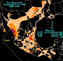 Thunderstorm activity near the eye soon decreased in coverage,[8] and Lidia began a weakening trend.[9] Because of two troughs, one over the northern Gulf of California and another over the Southwestern United States, the weakening system began to re-curve northeast. Heading towards mainland Mexico,[1] the hurricane weakened significantly a day after its peak, in which Lidia was only a mid-level Category 2 hurricane.[10] Continuing to weaken, Lidia made landfall in Sinaloa at 1800 UTC on September 13. Shortly after landfall, Hurricane Lidia then accelerated northeastward and then east-northeastward. It weakened to a depression just after crossing the international border with Texas. Tropical Depression Lidia dissipated near Austin on September 14. The remnants of the cyclone were absorbed by a cold front.[11]
