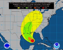 Tropical storm watches were issued in parts of the Lesser Antilles on September 22. These were upgraded to warnings the next afternoon, and all advisories were dropped late on September 23 once the storm had passed.[1] Over the next week, the islands of Hispaniola, Jamaica, Cuba, the Caymans, and the Yucatán Peninsula were all under advisories of some kind at different times.[1] Hurricane and tropical storm watches were issued for the Gulf Coast on October 1, and were upgraded to warnings the next morning.[1] They were discontinued after the storm moved past the following day.[20]
