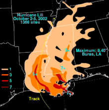 Lili caused extensive damage through the Caribbean, particularly to crops and poorly built homes.[2] Mudslides were common on the more mountainous islands, particularly Haiti and Jamaica.[3] In the United States, the storm cut off the production of oil within the Gulf of Mexico, and caused severe damage in parts of Louisiana. Lili was also responsible for severe damage to the barrier islands and marshes in the southern portion of the state. Total damage amounted to $925 million (2002 USD), and the storm killed 15 people during its existence.[1][4]