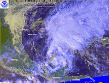 ![]() Hurricane Mitch at peak intensity just to the northeast of Honduras on October 26 | |