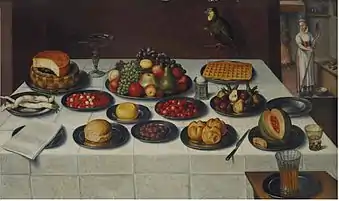 - Attribué a Huybrecht Beuckelaer, Mûres, cerises, poires, melon et autres fruits, panais, pain, fromages et une gauffre, roemer, tazza et salière sur une table drapée at Christie's (in French)