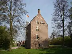 The castle was a typical stronghold that was at one time situated on the edge of a lake called the Lisser Poel[1] (since poldered in) that itself was in connection to the Haarlemmermeer (itself a polder since in 1853). In 1630 a stately home was built on to the tower and became a summer residence, but after the Haarlem Lake was poldered in the 19th century it fell into disuse and became a ruin.[1] In 1973 restoration began and the roof was built in the manner of 16th century carpentry.[1]