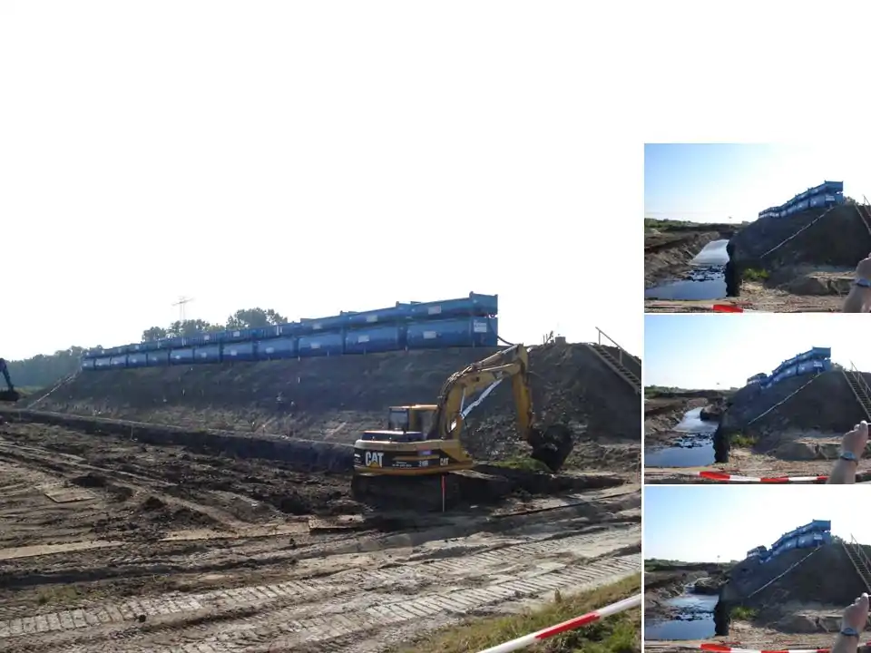The dike was roughly 100m long, 30m wide and 6m high and consisted of a nucleus of white sand and a shell of clay. A drainage system was placed at the bottom of the sand nucleus, allowing the addition or removal of water. Containers were placed on top of the dike, eventually to be filled with water. The subsoil was charted carefully, whilst the dike contained numerous proven and experimental sensor systems. In addition to that, the dike was carefully monitored from the outside by lidar and visual and infrared camera systems, and, of course, numerous people. When the dike was completed, on Friday September 26, a ditch was cut in the soil and subsoil. After 16 hours, at 08.00h on Saturday 27 of September 2008, the waterlevel in the dike was raised. At 16.02h, the dike collapsed.