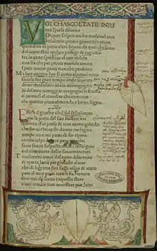 Though the majority of Petrarch's output was in Latin, the Canzoniere was written in the vernacular, a language of trade, despite Petrarch's view that Italian was less adequate for expression.[1] Of its 366 poems, the vast majority are in sonnet form (317), though the sequence contains a number of canzoni (29), sestine (9), madrigals (4), and ballate (7). Its central theme is the poet's love for Laura, a woman Petrarch allegedly met on April 6, 1327, in the Church of Sainte Claire in Avignon. Though disputed, the inscription in his copy of Virgil records this information. Petrarch's meticulous dating of his manuscripts has allowed scholars to deduce that the poems were written over a period of forty years, with the earliest dating from shortly after 1327, and the latest around 1368. The transcription and ordering of the sequence itself went on until 1374, the year of the poet's death.[2] The two sections of the sequence which are divided by Laura's death have traditionally been labelled 'In vita' (In life') and 'In morte' (In death) respectively, though Petrarch made no such distinction. His work would go on to become what Spiller calls 'the single greatest influence on the love poetry of Renaissance Europe until well into the seventeenth century'.[3]