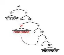 Inalienable possession constructions involve two nouns or nominals: the possessor and the possessee. Together, they form a unit, called a determiner phrase (DP). Within the DP, the possessor nominal may occur either before the possessee (prenominal) or after its possessee (postnominal), depending on the language.[12] French, for example, can use a postnominal possessor (the possessor (of) Jean occurs after the possessee the arm):