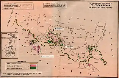 Some individual enclaves were composed of several administrative units (chhits and/or mauzas). These administrative units must be differentiated from the enclave as a whole. "This is particularly important for the Cooch Behar enclaves, where the several administrative units which together form some of the larger enclaves are commonly, but wrongly, termed enclaves themselves, or where one component unit commonly lends its name to the whole enclave. ... [T]he official Indo–Bangladesh Boundary Commission figure of 111 Indian and 51 Bangladeshi exchangeable enclaves would appear to count only individual mauzas, even when these consisted of more than one enclave."[3] There is not a one-to-one relationship between enclaves, chhits and mauzas.[3]
