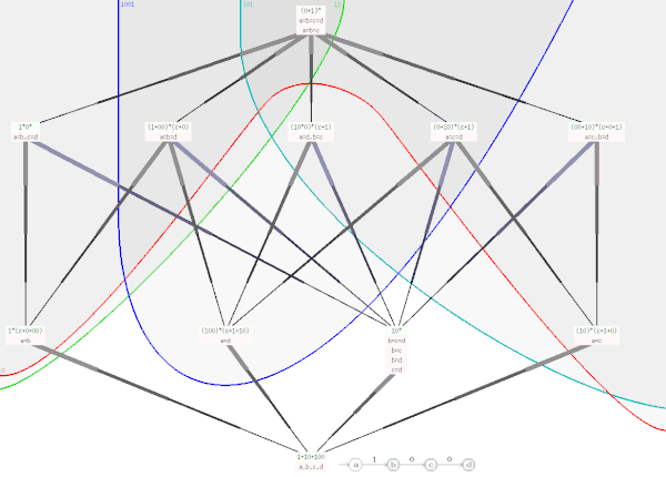 For the above example string set { 1, 10, 100 }, the picture show at its bottom the undergeneralized automaton Aa,b,c,d in grey, consisting of states a, b, c, and d. On the state set { a,b,c,d }, a total of 15 equivalence relations exist, forming a lattice. Mapping[note 2] each equivalence E to the corresponding quotient automaton language L(Aa,b,c,d / E) obtains the partially ordered set shown in the picture. Each node's language is denoted by a regular expression. The language may be recognized by quotient automata w.r.t. different equivalence relations, all of which are shown below the node. An arrow between two nodes indicates that the lower node's language is a proper subset of the higher node's.