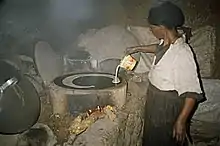 Traditional clay stoves can be inefficient in that they consume large amounts of firewood and produce a lot of smoke, creating household pollution and making them dangerous to use around children.[14] In 2003, an Eritrean research group designed a stove for cooking injera and other foods that uses more easily available fuel, such as twigs instead of large branches, crop residues and dung, locally called kubet.[15] Several parts of this new stove are made in the central cities of Ethiopia and Eritrea, while other parts are moulded from clay by women in local areas.[15]