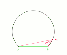 Let O be the center of a circle, as in the diagram at right. Choose two points on the circle, and call them V and A. Draw line VO and extended past O so that it intersects the circle at point B which is diametrically opposite the point V. Draw an angle whose vertex is point V and whose sides pass through points A and B.