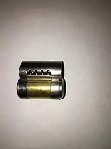 An interchangeable core or IC is an adaptable locking key cylinder. Unlike a standard key cylinder, which is accessible for combinating only via locking device disassembly, an interchangeable mechanism relies upon a specialized "control" key for insertion and extraction of the essential (or "core") combinating components. "Small format" interchangeable cores are in a figure-eight shape that is standard among lock manufacturers. "Large format" interchangeable cores are of varying sizes.[1] Interchangeable cores can be extracted from one lock type (bored cylindrical lock, mortise lock, padlock and so forth) and then installed into another without requiring the removal or disassembly of any single component. These units are readily adapted for master keying systems and can be set up with spare cores and keys for quick replacement when security is compromised, such as when a key is lost or stolen or when a personnel change takes place. Extracted cores can then be recombinated without urgency and placed back into maintenance storage for future use.