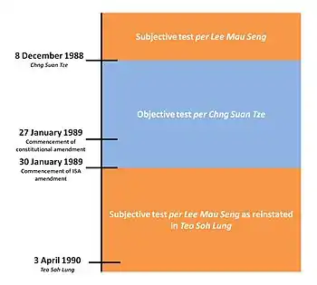Parliament subsequently passed the Constitution of the Republic of Singapore (Amendment) Act 1989[77] and the Internal Security (Amendment) Act 1989.[78] They took effect on 27 and 30 January 1989 respectively. Section 8B(1) of the amended ISA provides that the law pertaining to the judicial review of decisions made by the President or the Minister was restored to the legal position applicable in Singapore on 13 July 1971, the date when Lee Mau Seng was decided. In Teo Soh Lung v. Minister for Home Affairs (1990),[79] the Court of Appeal held that these amendments reinstated the legal position set out in Lee Mau Seng as the applicable law governing judicial review in Singapore, thus prompting a return to the subjective test in reviewing the exercise of executive discretion under the ISA.[80]