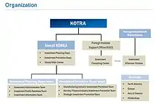 Based within the KOTRA headquarters in Seoul, the head of Invest KOREA is supported by staff members who are KOTRA employees, recruited specialists in investment-related fields, and civil servants seconded from other agencies and ministries, including the Ministry of Trade, Industry and Energy under whose umbrella Invest KOREA falls. Invest KOREA works in collaboration with its network of 39 overseas branch offices called Korea Business Centers (KBCs), which are located in financial and industrial hubs around the world. Invest KOREA implements government policies on foreign investment that have been formulated by the Ministry of Trade, Industry and Energy and coordinated by the Foreign Investment Committee.