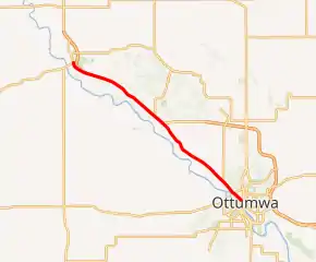 Iowa 23 began in downtown Ottumwa underneath a bridge on which US 63 passed overhead. Direct access to US 63 was provided by a ramp which connected to Kitterman Avenue. The first three quarter-miles (1.2 km) of the highway was on a one-way couplet; northbound Iowa 23 followed 2nd Street West, while southbound was on Main Street West. The two directions converged at an intersection with McPherson Street, which is located next to a level crossing of the Dakota, Minnesota and Eastern Railroad.[2] As Iowa 23 left Ottumwa, it traveled northwest on a two-lane highway with narrow shoulders.[3]