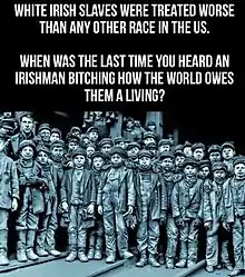 The Irish slaves myth is a pseudohistorical narrative that falsely conflates the penal transportation and indentured servitude of Irish people during the 17th and 18th centuries with the hereditary chattel slavery experience of enslaved Africans. Some white nationalists, and others who want to minimize the effects of hereditary chattel slavery on Africans and their descendants, have used this false equivalence to promote racism against African Americans[1] or claim that African Americans are too vocal in seeking justice for historical grievances.[2] It also obscures the history of Irish involvement in the transatlantic slave trade, often serving Irish republican ends.[3][4]