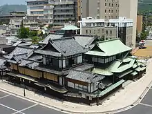 Dogo Yunomachi means the hot spring town of Dogo. The spring had good quality and visiting it was cheap, so it was popular among the people of the town. Because the flow of hot spring water was small, it couldn't be divided and brought to hotels. Since about 1603, the hot spring had been divided into three hot spring rooms and a free outdoor hot spring for cures. Those two springs supported Dogo Yunomachi. However, both of them were quite old and needed to be renewed.[6]