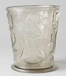 The majority of the decorative traditions used in the Early Islamic Period concerned the manipulation of the glass itself, and included trail-application, carving, and mold-blowing.[16] As mentioned previously, glass-carving and trail application are a continuation of older techniques, the former associated with Sassanian glassmaking and the latter with Roman traditions. In relief cutting, a specialized form of glass-carving most often used on colourless and transparent glass, "the area surrounding the decorative elements was carved back to the ground, thus leaving the former in relief".[25]