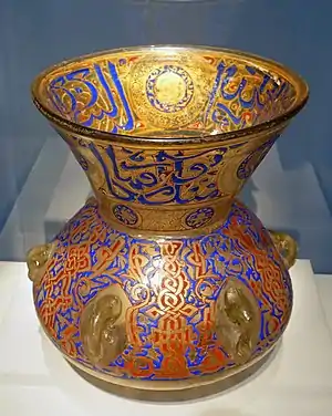 Gilding during this period involved applying small amounts of gold in suspension onto a glass body, followed by a low firing to fuse the two materials, and was adopted from Byzantine traditions.[49] This technique was often combined with enamelling, the application of ground glass with a colourant, to traditional and new vessel forms, and represents the height of Islamic glassmaking.[50] Enamelling, a resurrection of older techniques, was first practiced in the Islamic world at Raqqa (Syria) during the late 12th century, but also spread to Cairo during Mamluk rule.[44][51] A study of various enamelled vessels, including beakers and mosque lamps, suggests that there are two subtle yet distinct firing practices, possibly representing two distinct production centres or glass-working traditions.[52] Due to its high demand, enamelled glass was exported throughout the Islamic world, Europe, and China during this period.[53] Enamelling eventually ended in Syria and Egypt following disruption by various Mongol invasions from the 13th through to the 15th centuries AD.[54]
