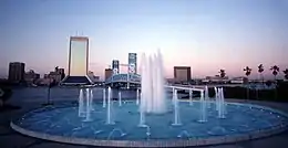 Jacksonville's early predominant position as a regional center of business left an indelible mark on the city's skyline. Many of the earliest skyscrapers in the state were constructed in Jacksonville, dating to 1902.[61] The city last held the state height record from 1974 to 1981.[62] The tallest building in Downtown Jacksonville's skyline is the Bank of America Tower, constructed in 1990 as the Barnett Center. It has a height of 617 ft (188 m) and includes 42 floors.[63][64] Other notable structures include the 37-story Wells Fargo Center (with its distinctive flared base making it the defining building in the Jacksonville skyline),[65][66] originally built in 1972–74 by the Independent Life and Accident Insurance Company, and the 28-floor Riverplace Tower. When this tower was completed in 1967, it was the tallest precast, post-tensioned concrete structure in the world.[67][68]