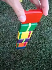 A Jacob's ladder (also magic tablets, Chinese blocks, and klick-klack toy[1]) is a folk toy consisting of blocks of wood held together by strings or ribbons. When the ladder is held at one end, blocks appear to cascade down the strings. This effect is a visual illusion which is the result of one block after another flipping over. It may be considered a kinetic illusion, where the blocks appear to change position when they do not.[1] Its name Jacob's Ladder comes from the biblical ladder to heaven, mentioned in Genesis 28:12.[1]