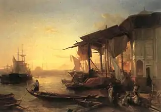 Still, he was dissatisfied with what he had seen so, in 1838, he left on a long sea voyage that would take him to Gibraltar, the North African coast, Egypt, the Dardanelles, Istanbul (where he remained for several months), Asiatic Turkey and Rhodes.[1] While in Ankara, he met and befriended his fellow Belgian painter, Florent Mols, and they continued travelling together; sailing down the Nile as far as Nubia. During these travels, he compiled two huge albums of drawings and notes that he would use for inspiration the rest of his life. In 1847, still restless, he toured Northern Germany and, in 1850, Scandinavia.
