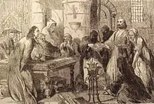The confusion was enhanced in 1805, when the French playwright and historian François Raynouard made claims that Jerusalem had been captured by the Mongols, with Molay in command of one of the Mongol divisions.[30] "In 1299, the Grand-Master was with his knights at the recapture of Jerusalem."[31] This story of wishful thinking was so popular in France that in 1846 a large-scale painting was created by Claude Jacquand, titled Molay Prend Jerusalem, 1299 ("Molay Takes Jerusalem, 1299"), which depicts the supposed event. Today the painting hangs in the Hall of the Crusades in the French national museum of Versailles.[32]