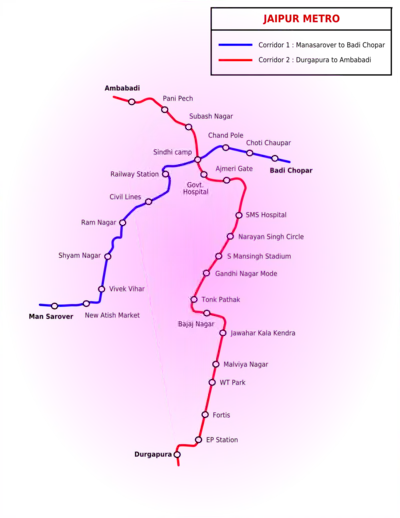 The first route of Jaipur Metro (East-West Corridor) connect Mansarovar to Badi Chaupar via Civil Lines and Chandpole. In Phase I-A, the metro was operating between Mansarovar to Chandpole. The construction of Phase-1B between Chandpole and Badi Chaupar is completed. This is the Metro line that got flagged off on 5 June 2015, and has been named as Pink Line, as it takes passengers to the Pink City.[1] The depot for this line is situated at Mansarovar.[18]
