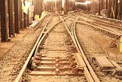 This underground station looks like a typical express station, with four tracks and two island platforms.[43] To the east (railroad north) is a large storage and relay yard consisting of two levels with four relay tracks each,[44] extending approximately .25 miles (0.40 km)[45] to around 184th Place.[lower-alpha 1][44][48]:923, 1597 This total of eight storage tracks gives 179th Street the highest peak terminal capacity of any station in the New York City Subway: 63 trains per hour, or one train every 57 seconds, although the station currently operates at a far lower throughput (only 17–18 trains per hour during peak hours).[lower-alpha 2][49][50] Terminating trains enter on one of the two northbound tracks, then relay to one of the two levels—the upper level if coming from the express track, or the lower level if coming from the local track.[44] They then return on the corresponding track on the southbound side.[52] Due to the switching configuration at the station, the few E trains that begin here always leave from the express track and run express along Hillside Avenue. F trains may leave from either track, switching to the local track east of 169th Street if necessary.[52] Outside of relay operations, the yard provides storage for four trains.[46] It is estimated that the relay tracks east of the station can fit about 600 passenger automobiles.[47]