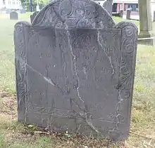 According to his tombstone, Draper died 13 July 1697,[7] and the following month, on 19 August, his widow appeared before the Suffolk County probate judge, petitioning the court to allow her two sons, James and Jonathan, to be given administration of her husband's estate.[2] The ensuing inventory showed a very modest estate valued at £72, of which £25 was the value given for the house, shop, barn and home lot.[8] The inventory also included an acre of meadow in Dedham.[8] His wife, Miriam, died the January after her husband's death [1697/8], and both James and Miriam Draper share a tombstone in the Westerly Burial Ground in West Roxbury, now a neighborhood of Boston. The entry plaque to the cemetery reads in part: "The oldest gravestone, from 1691, commemorates James and Merriam Draper, members of a prominent West Roxbury family." The year 1691 is incorrect; James died 13 July 1697 and his widow Miriam died the following January, which correctly reads "January 1697" on the marker, but technically should read 1697/8, as January was near the end of the year in the old calendar. Also, there was no town of West Roxbury when these people flourished; they lived in what was then called Roxbury.