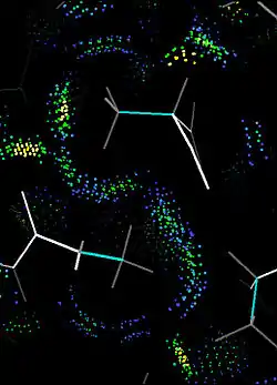 The Richardsons' more recent work has diversified beyond classification and crystallography. In the 1980s they stretched into the fields of synthetic biochemistry and computational biology as pioneers in the de novo design of proteins, a reverse engineering approach to make and test theoretical predictions about protein folding.[27] In the 1990s the Richardsons developed the kinemage system of molecular graphics and David Richardson wrote the Mage program to display them on small computers, for the then-new journal Protein Science.[28] Additionally, they developed all-atom contact analysis (see image) to measure "goodness of fit" inside proteins and in interactions with surrounding molecules.[4] The Kinemage website offers interactive exploration of various 3D protein structures through computer displays using their Mage or KiNG graphics programs. Funded by a National Institute of Science (NIH) grant, the website is often used as a teaching tool. Textbooks and internet sites that have sourced images from Kinemages include Introduction to Protein Structure by Branden & Tooze,[29] Fundamentals of Biochemistry by Viet, Voet & Pratt,[30] Principles of Biochemistry by Horton et al.,[31] and the University of Mississippi's Kinemage Authorship Project.[32]